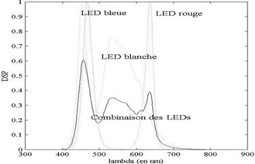 Nos calculs, caractérisations et simulations indiquent que la source de lumière peut être composée de LEDs blanches froides LEDs blanches chaudes, LEDs rouges et LEDs bleues.